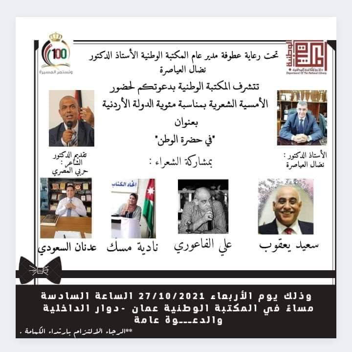 كرم مدير عام المكتبة الوطنية الدكتور نضال العياصرة عدد من الشعراء في أمسية شعرية أقامتها المكتبة بمناسبة مئوية الدولة بعنوان “في حضرة الوطن”