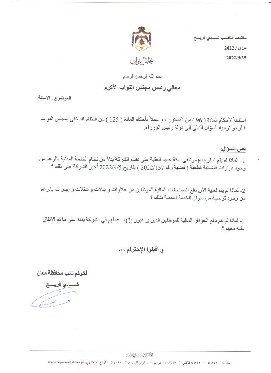 الغواص نيوز – وجه النائب شادي فريج استنادا لاحكام المادة 96 من الدستور الاردني وعملاً بأحكام المادة 125 من النظام الداخلي لمجلس النواب، سؤالاً الى رئيس الوزراء بشر الخصاونة حول استرجاع موظفي شركة سكة حديد العقبة على نظام الشركة بدلاً من نظام الخدمة المدنية بالرغم من وجود قرارات قضائية قطعية تجبر الشركة على ذلك.